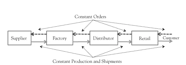Supply chains are often viewed as a simple, static system with constant demand, constant orders, and constant production. Generally, these supply chains are viewed as a simple linear âchainâ of participants such as a retail store, a distributor, a factory, and perhaps a key supplier to the factory as shown in Figure 1.1.