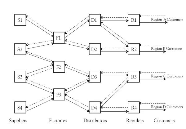In todayâs supply chains, complexity arises not only from dynamics but also from the sheer number of participating entities. The typical supply chain involves hundreds, if not thousands, of suppliers, multiple factories, numerous distribution centers, and customers spread across the globe. These supply chains are often depicted as shown in Figure 1.2. Although more complex, they are again primarily analyzed in a static mode of constant flows of orders and material or with constant statistics. These more complex networks can also be analyzed for minimum cost at a specified level of customer service. These optimization solutions, however, fail to predict supply chain dynamics and the substantial swings that can occur in inventories, orders, and shipments as in the bullwhip. In order to understand and correct those problems, a dynamic view and model of the supply chain is required.