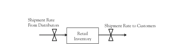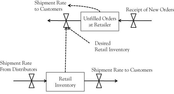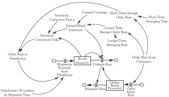 A simple model as shown in Figure 1.5 can also help illustrate model development and simulation. Whereas Forresterâs model included three stages in a supply chainâfactory, distributor, and retailerâthis illustrative model includes only the retail sector. In the model, a retailer receives orders from customers. Shipments occur after a day or so of processing but only if inventory is available. In terms of assessing the inventory position, the retailer compares the current inventory with a desired level of inventory. As inventory falls below the desired level, the retailer slows shipments to avoid running out of inventory. The retailer tries to maintain 2 weeks of average sales as the desired level of inventory, often termed a 2-week coverage. To be conservative in this determination, the retailer averages sales over a 4-week period, smoothing out any potentially misleading short-term fluctuations. The desired inventory is then twice this 4-week average. The retailerâs order to the distributor is composed of the recent order rate plus a term that is proportional to the difference between the inventory and the desired inventory. This second component reflects a corrective feedback mechanism that drives inventory toward the desired level. This type of corrective action is a key feature of supply chain management and is widely reflected in the real world. The ability to capture this corrective feedback is a key aspect of system dynamics. It is assumed in this simple model that inventory is always available at the distributor so that after an average 4-week processing and shipment delay, the ordered shipments arrive at the retailer.