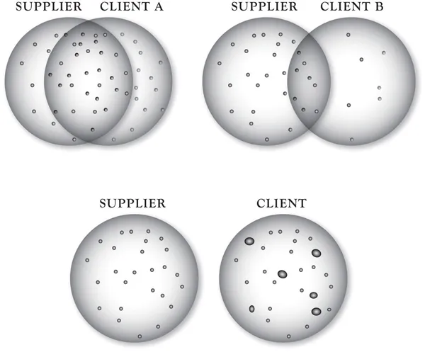 Panel B illustrates how a client values the product attributes differently, as shown by the relative size of the dots in the right-hand circle. The larger the dot, the greater the value placed on that attribute. The smaller the dot, the lower the value placed on the attribute. Some attributes are not valued at all, and a careful comparison will reveal where a dot that appears in the supplierās c...