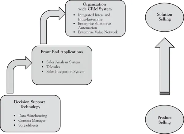 Sales technologies have evolved and developed quite dramatically over a short period of time. Similar to the change from an organizationās orientation from product selling to solution selling, sales technology has witnessed some major transformations (Figure 1.1). In its early stages, technology was mainly used to support decisions focused on how to gain market share. Later, front-end applications such as sales analysis systems, sales integration systems, and the like emerged to address the changes in the marketplace. Currently, as companies seek to gain the share of the customerās mind, enterprise-wide CRM solutions are prevalent. Organizations that adopt enterprise value networks are striving for solution selling to provide customers with the highest possible value.