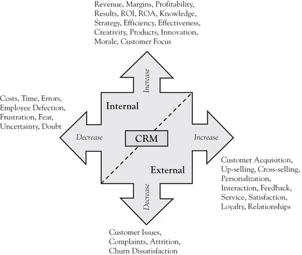 CRM solutions are offering fully functional, embedded workflow tools that are enabling firms to automate the greater part of regular, as well as unique, processes that are present among most customer-centric businesses. For example, CRM solutions make it possible to route a customer service request based on precedence or the nature of the case. A workflow can be established that sets off explicit actions or notifications based on the customer, the incident, or time-based conditions. Yet, despite the numerous benefits offered by CRM technology, it remains elusive to many firms. The primary reason for this elusiveness is that companies often focus only on the investment cost and ignore the CRM value proposition (Figure 1.3).