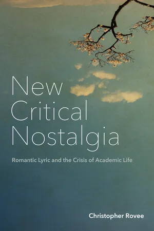 New Critical Nostalgia weighs the future of literary study by reassessing its past. It tracks today's impassioned debates about method back to the discipline's early professional era, when an unprecedented makeover of American higher education with far-reaching social consequences resulted in what we might call our first crisis of academic life. Rovee probes literary study's nostalgic attachments to this past, by recasting an essential episode in the historiography of Englishâthe vigorous rejection of romanticism by American New Criticsâin the new light of the American university's tectonic growth. In the process, he demonstrates literary study's profound investment in romanticism and reveals the romantic lyric's special affect, nostalgia, as having been part of English's professional identity all along.