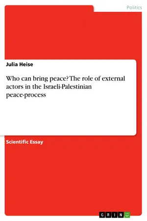 Scientific Essay from the year 2005 in the subject Politics - Region: Near East, Near Orient, grade: 63% (1, 7), University of Edinburgh, course: The Middle East in International Politics, language: English, abstract: The Arab-Israeli conflict, the dominant theme regarding the International Relations of the Middle East, is"(…) one of the most bitter, protracted and intractable conflicts of modern times." (Shlaim, 2005: 242). At its core lies the Israeli-Palestinian problem, which will be addressed in this essay and which mainly refers to the dispute between the Jewish and Palestinian national movements over Palestine.1 This dispute is multidimensional: "(…) religious, political, cultural, economic and psychological elements pile up and feed each other to create a seemingly indissoluble impasse." (Korany, 2005: 64). Some attempts have been made in the past to find a peaceful solution for Israelis and Palestinians - but these did not result in the success that was hoped for. However, by considering several recent developments it appears that new opportunities to end the conflict are within reach. Against this background it becomes necessary to discuss the impact of Israelis, Palestinians and external actors on a possible peace, which will be the purpose of this essay. The paper first provides an overview about the main issues of the Israeli-Palestinian dispute. Section two then reflects on the development of the peace-process in the past and in this context analyses the roles of Israel, Palestine and external actors that were involved. This is essential to be able to draw a profound conclusion regarding the current situation, which is discussed in section three by addressing two questions: A) What are the chances for peace? B) Who plays a major role in this context? The essay concludes by answering the question of whether it is only the conflict-parties and not external actors who could bring peace. 1 Shlaim, 2005: 242. However, the conflict is complicated by inter-Arab relations and the involvement of outside powers.