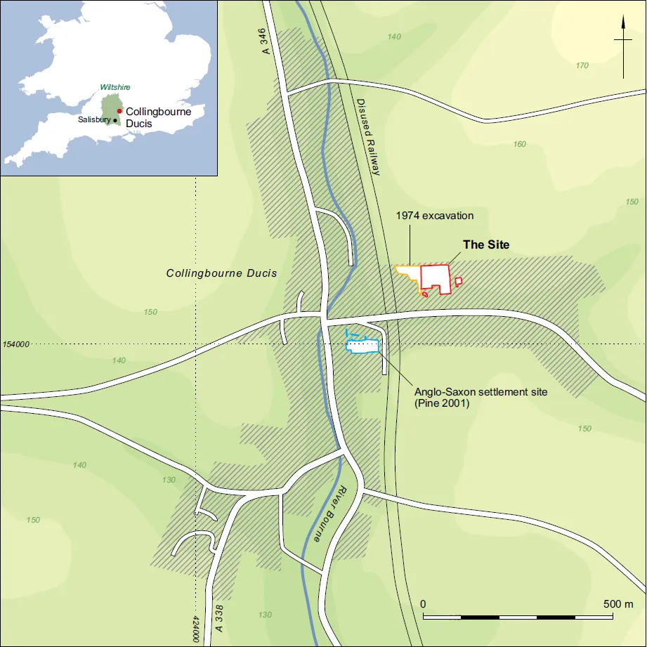 The site lay on the eastern side of the Wiltshire downland village of Collingbourne Ducis, between Marlborough and Amesbury (SU 2463 5419; Fig. 1.1). The village, situated in a valley on the eastern edge of Salisbury Plain, derives its name from the River Bourne ā a tributary of the Avon ā that runs 200 m to the west; the Upper Bourne river was previously known as the Coll. The MarlboroughāAndover road (A338 and A346) passes northāsouth through the village and likely follows an early route along the Bourne Valley (Baggs et al. 1999; Kennet District Council (KDC) 2002, 1).