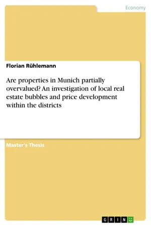 Master's Thesis from the year 2014 in the subject Business economics - Miscellaneous, grade: 1, 3, University of Regensburg (Lehrstuhl für Immobilienfinanzierung (International Real Estate Business School, University Ratisborn)), language: English, abstract: The burst of the US- real estate bubble in the year 2008 has contributed significantly to the global financial crisis, from which the global economy is still recovering from. In the US, housing prices collapsed after years of increase, which led to credit de-faults and the collapse of the banking system. The subprime crisis, however, was only the highlight of a great new set of consequential price bubbles on international real estate means, which could be seen to swap over to Spain as well as Ireland. This poses the question whether real estate bubbles might exist in Germany. The opinions of the nation are divided. The German city investigated particularly in this article is Munich, since prices are at an all-time high and have been rising continuously during the last decades. To be more specific, this master thesis aims to identify whether there is a local real estate bubble within the German city Munich. This is done by regressing two sets of data and using a stock-flow model in order to determine the relationship between housing prices and explanatory macroeconomic variables: The first set is a time series regression on a whole city perspective within the years 1975 and 2013. The second set is a panel data analysis on district basis within the years 2000 to 2012. Results suggest that in the first set condominium prices are moderately and rowhouse prices are slightly overvalued in Munich, especially in the recent years. The results of the second set illustrate an overvaluation of condominium prices on a slightly lesser level.