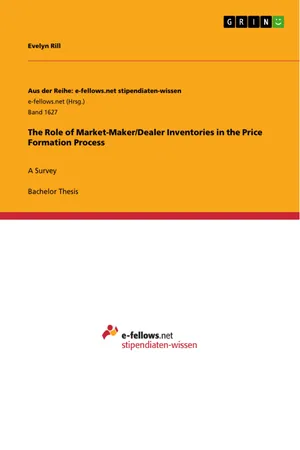 Bachelor Thesis from the year 2015 in the subject Business economics - Economic Policy, grade: 1, 3, University of Frankfurt (Main) (Faculty of Economics and Business Administration), course: Chair of Corporate Finance, language: English, abstract: Due to the importance of inventories and the fact that asymmetric information models are extensively discussed in literature, this thesis exclusively focuses on inventory control models and provides a survey of theory and empirical results on the role of inventory in the price formation process. Because most of the relevant literature is based on the U.S. exchange market, this thesis is mainly confined on inventory control of specialists on the New York Stock Exchange (NYSE) and of dealers on the National Association of Securities Dealers (NASDAQ). To understand the costs of holding inventory, Section 2 introduced three important drivers of inventory: capital constraints, liquidity and volatility. Section 3 summarises the effect of market maker inventory and its costs on liquidity and how this affects the bid-ask spread. In Section 4, the impact of inventory on asset prices, especially of inventory levels, is discussed in more detail. Section 5 briefly turns to changes in market structure and how they affect the role of traditional market makers and their inventories. Section 6 finally concludes.