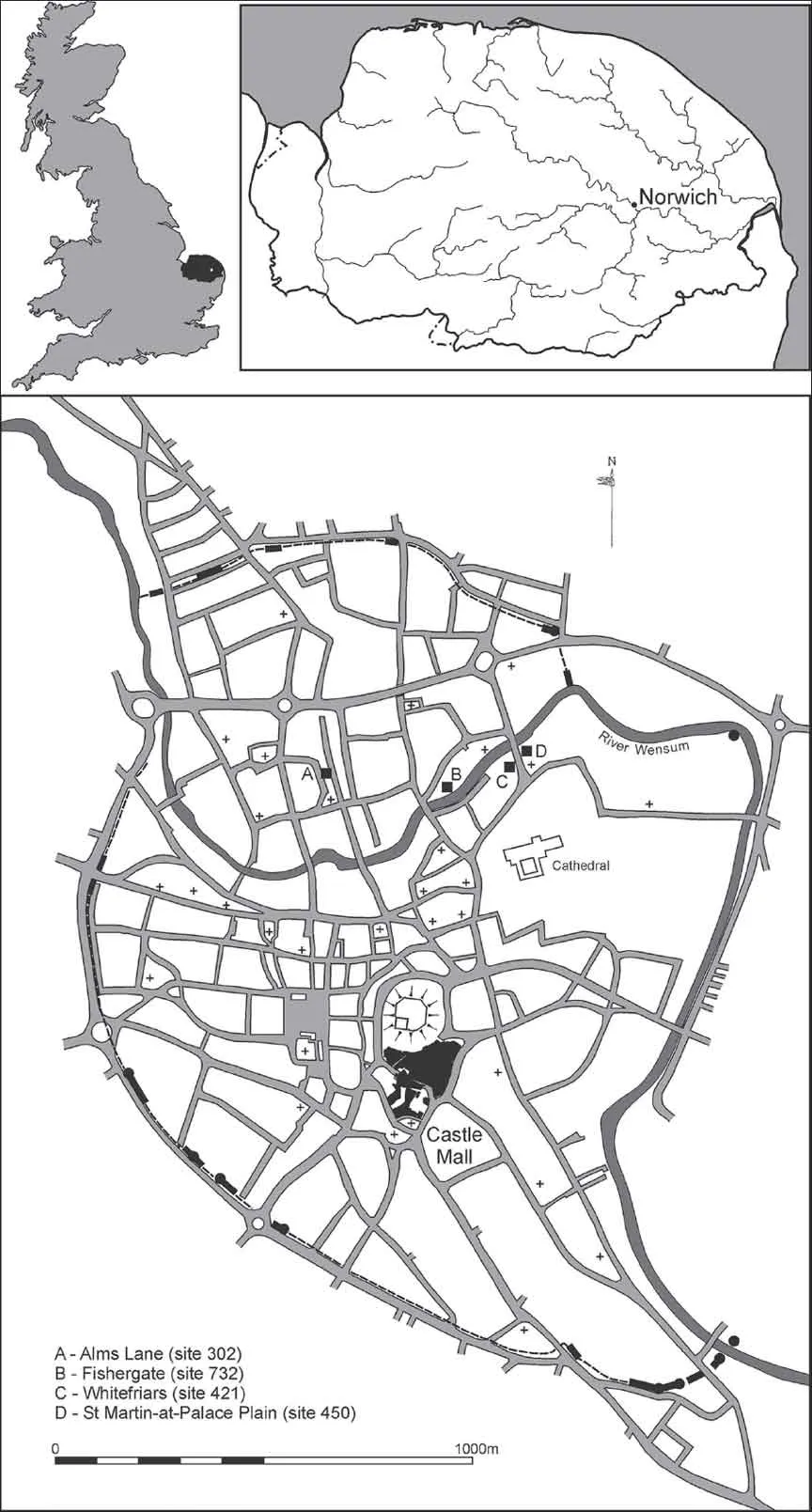 Figure 1.1. Location of Norwich and of the Castle Mall and Golden Ball Street sites (Norfolk Museums Service).