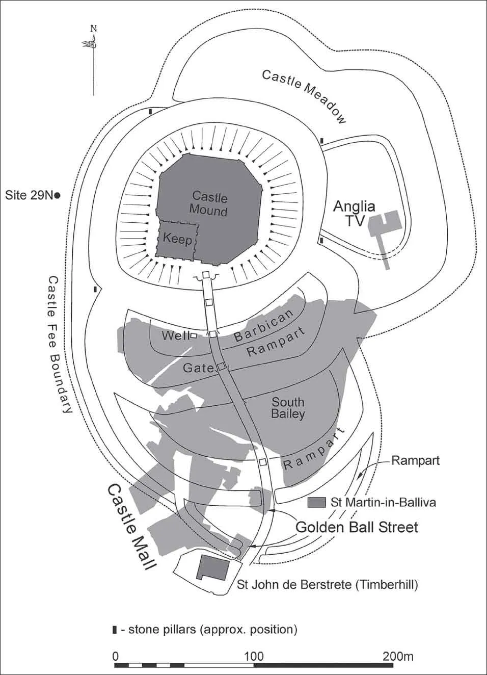 Cet article approfondira lâinterprĂ©tation archĂ©ologique du chĂąteau de Norwich et de ses remparts, un joyau de son Ă©poque. Son donjon normand impressionnant a Ă©tĂ© dĂ©crit comme Ă©tant, sur le plan architectural, une des constructions les plus ambitieuses de son temps en Europe occidentale. Il a Ă©tĂ© parmi les 40 premiers chĂąteaux urbains Ă ĂȘtre construits avant 1100, et sa surface sâĂ©tend sur une grande partie du territoire de Norwich qui est devenue lâune des villes majeures dâAngleterre en 1066. Pendant presque un siĂšcle, Norwich a Ă©tĂ© lâunique chĂąteau royal dans le Norfolk et le Suffolk et a exercĂ© les fonctions de centre administratif dans une rĂ©gion extrĂȘmement riche. Une importante clĂŽture de terres relevant directement de la couronne â les âdroitsâ ou âlibertĂ©sâ (Fee ou Liberty) du chĂąteau â Ă©tait dĂ©limitĂ©e dans la proximitĂ© immĂ©diate du chĂąteau et la juridiction royale a Ă©tĂ© maintenue dans cette enceinte jusquâen 1345. Deux grands murs dâenceinte furent Ă©rigĂ©s au sud et au nord-est de cet enclos, devenue plus tard la rue de Castle Meadow. Une barbacane fut ajoutĂ©e au XIIIe siĂšcle. Au milieu du XIIIe siĂšcle, le chĂąteau de Norwich se trouvait au cĆur dâune ville fortifiĂ©e plus vaste que Londres, son dĂ©veloppement Ă©tant influencĂ© par le cours caractĂ©ristique de la riviĂšre Wensum.