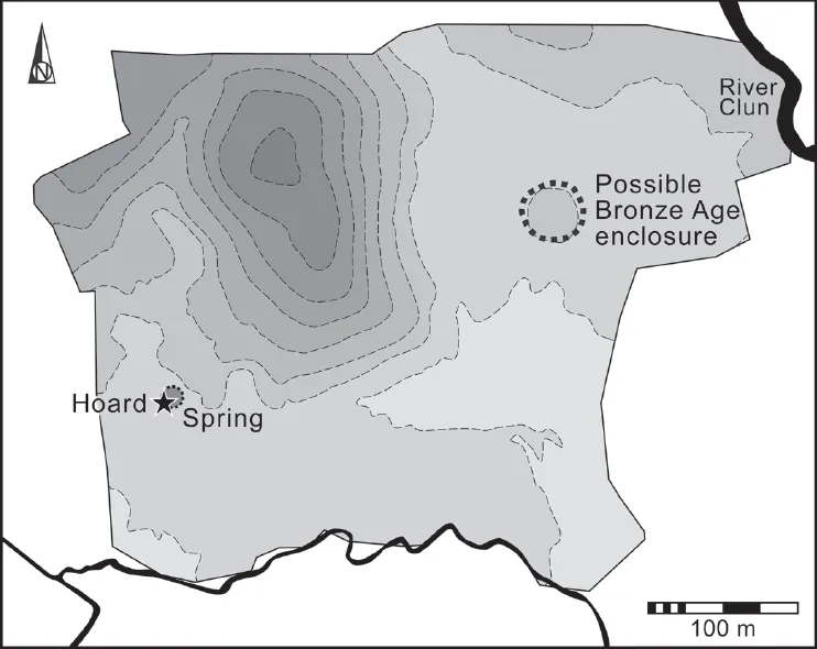 Figure 2. Outline plan of the Broadward complex showing the spring where the Late Bronze Age hoard was found and the position of a circular enclosure apparently of similar date. The two locations cannot be seen from one another and are separated by an area of higher ground. Information from Bradley et al. (2015).