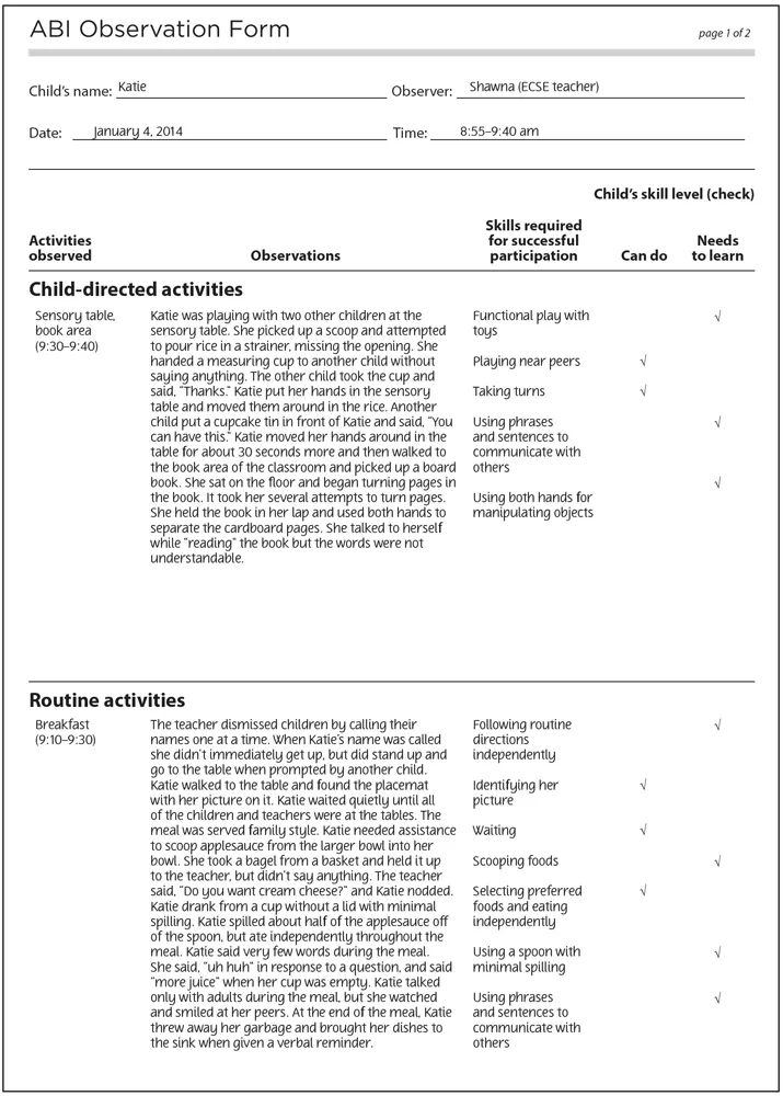 Structured observation: The team was specifically concerned with gathering information on Katieās responses while at school during child-directed, routine, and planned activities using the ABI Observation Form (Figure 9.1)