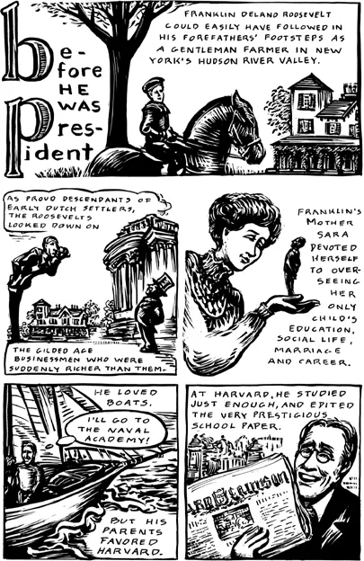 Compared to these powerful and dynamic personalities, Franklin, an only child, seems to have been shy. He spent his early years as much with adults, mainly his parents and his wealthy relatives, as with children his own age. He even wore long blond curls until he was five and dressed in what was known as a âLord Fauntleroyâ suit, the dandified outfit of the sons of the English aristocracy. His father, fifty-two years old at Franklinâs birth, was old enough to be a grandfather, but when not engaged in business ventures, romped with his beloved son through the family estate, hiking, fishing and riding horses. On a business trip to Wisconsin, his father introduced Franklin to bird lore, part of the fascination with nature that the future president had through life. As he grew, his mother remained highly protective, determined to organize every detail of his young life. He was kept at home with tutors, out of school until age fourteen, then sent to Groton, a new prep academy full of other children of extreme privilege.
