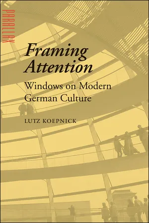 In Framing Attention, Lutz Koepnick explores different concepts of the windowāin both a literal and a figurative senseāas manifested in various visual forms in German culture from the nineteenth century to the present. He offers a new interpretation of how evolving ways of seeing have characterized and defined modernity. Koepnick examines the role and representation of window frames in modern German cultureāin painting, photography, architecture, and literature, on the stage and in public transportation systems, on the film screen and on television. He presents such frames as interfaces that negotiate competing visions of past and present, body and community, attentiveness and distraction. From Adolph Menzel's window paintings of the 1840s to Nam June Paik's experiments with television screens, from Richard Wagner's retooling of the proscenium stage to Adolf Hitler's use of a window as a means of political self-promotion, Framing Attention offers a theoretically incisive understanding of how windows shape and reframe the way we see the world around us and our place within it. Errata: Chapter 2, "Richard Wagner and the Framing of Modern Empathy"