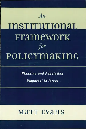 An Institutional Framework for Policymaking offers a new approach to the study of institutions and adds to the growing body of literature in the field of "new institutionalism." Dr. Matt Evans utilizes previous characterizations of institutions to analyze the framework affecting policymaking and the tools used for policy implementation. In examining the effect of institutional change on public policy, this book compares the implementation of population dispersal policy in Israel over two fifteen-year periods. The first period, which includes the years between 1951 and 1965, was characterized by limited electoral competition and societal values that emphasized collective over individual interests. By contrast, the period from 1988 to 2002 constituted a framework of heightened political competition and public policies geared toward individual and group interests. An Institutional Framework for Policymaking provides a critical examination of the role of coercion in public policy, and provides insight into the relevance of national plans and their effectiveness in modern governance. The research in this book will appeal to scholars of political science, public policy, and urban planning.