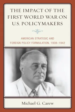 The Impact of the First World War on U.S. Policymakers: American Strategic and Foreign Policy Formulation, 1938–1942 is designed to recount the formulation of foreign and defense policies through an examination of the background of the policymakers, with specific emphasis on the World War I experience. The introduction provides an analysis of the literature of the history of this American World War II policy formulation. The events and factors that led to the reorientation of priorities in 1938-1939 are examined. From that base, Michael Carew reviews the unfolding events of the European and Japanese degeneration into war through the spring of 1940, and their perception for the American policy-makers. He also recounts the tectonic shifts of the subsequent eighteen months and the scramble for an American response. The immediate consequences of Pearl Harbor brought the policymaking to a crisis, and the Casablanca conference of January 1943 signified the completion of the formulation of American foreign policy and naval-military strategy. Carew emphasizes the leadership of President Roosevelt and his cadre of planners in the policy formulation realm, the assertion of leadership of the alliance, and Roosevelt's specific tasks in managing the American war effort. These presidential tasks included the industrial mobilization of the American economy, the domestic political leadership of the war, the persuasion of the alliance to the propriety of American policy, and the defeat of the Axis.