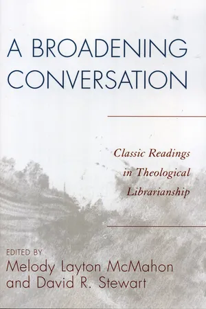 This collection is likely to be valuable in many ways: as a compendium of wisdom and "best practices" over several generations, as a means of securing a grasp of how ATLA's importance and influence as an association has grown over time, and even for the way it brings back to light the life and work of so many fine librarians, Raymond Morris (Yale Divinity Library) and Julia Pettee (Union Theological Seminary) among them. Even more important, A Broadening Conversation affirms vividly that (instead of the ethos of tradition and continuity that one might suppose) a mix of trusted routines with perpetual change is what has always been on the menu for theological librarians in their daily work. This is at the heart of what continues to make theological librarianship such a challenging and rewarding vocation.
