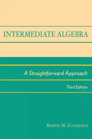 Yes, you can access Intermediate Algebra by Martin M. Zuckerman in PDF and/or ePUB format, as well as other popular books in Education & Education General. We have over one million books available in our catalogue for you to explore.