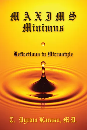 Maxims Minimus is the sedimentation of over forty years of experience in teaching, writing, and treating patients. As many other poets, T. Byram Karasu dares to be just so clear, and no clearer. Thus, Dr. Karasu's Maxims is well suited for this age of Twitter and text messages. He says, "Anything that cannot be said in 140 characters (or in 140 seconds) is not particularly worth saying." This book is Dr. Karasu's reflections about loving, working, living, dying, and everything else—his philosophy of life expressed in microstyle.