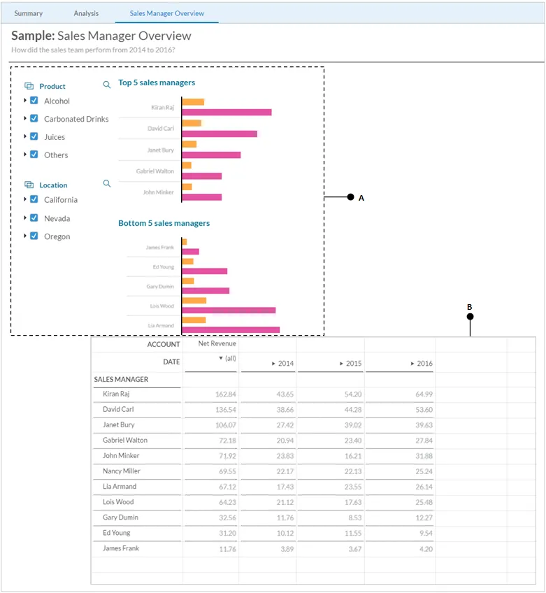 - Once again, click on the Add Measure link in the Measures section, and select Net Revenue as the second measure for this chart. Both the charts on this page will reveal the values of the sold quantity and the amount earned from sale proceeds by sales managers.