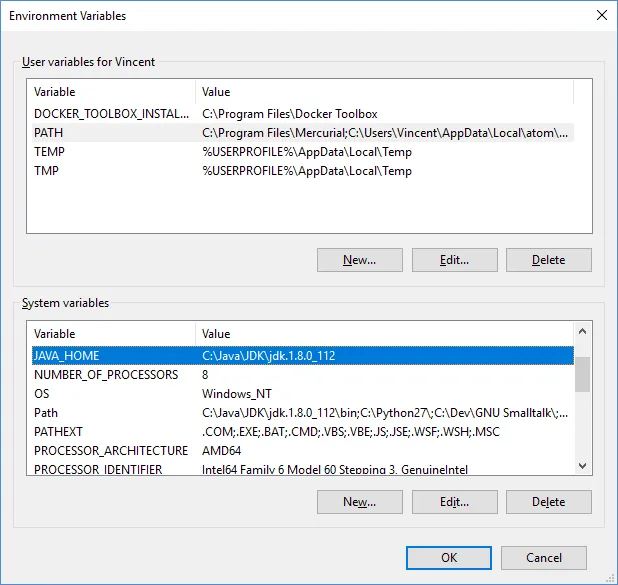 - Enter JAVA_HOME as the variable name and the full path to the root of JDK's installation directory as the value. Then click on OK to close the window.