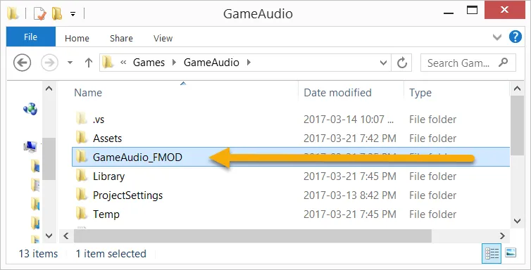 - Again, use your computer's file explorer to locate and open the GameAudio Unity project folder. Paste the GameAudio_FMOD folder into the GameAudio folder so it looks similar to the following screenshot: