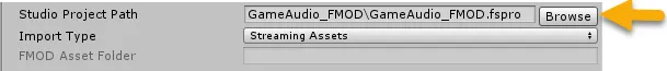 - Open the Unity editor and from the menu, select FMOD | Edit Settings. Go to the Inspector window and confirm that the Studio Project Path is still set correctly from the last chapter or set it using the Browse button as shown in the screenshot here: