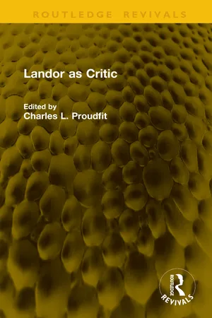 First published in 1979, Landor as Critic is a comprehensive study of Walter Savage Landor's critical writings, showcasing his contributions as a literary critic and his influence on literature. The book features the most representative examples of Landor's criticism across various literary forms, including private and public letters, imaginary conversations, reviews, poems, and prose commentaries, arranged chronologically within each category. With detailed analysis and thoughtful selections, this work is an essential resource for literary scholars and enthusiasts.