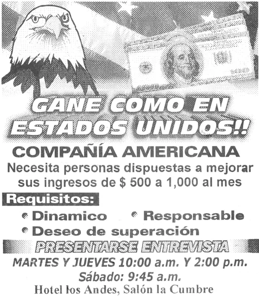 Near the beginning of my fieldwork, a young man named Wilmer told me that he had something to show me. It was a small paper flyer (figure 2) that someone handed to him as he got off the bus in a nearby town. The flyer was money-green, with words printed over a picture of a bald eagle, hundred dollar bills, and an American flag. The text read, âGane como en Estados Unidos!!â (Earn like in the United States). Someone had handed the flyers to all the passengers on the bus arriving from the countryside. Below the headline it said, âAmerican Company needs people willing to improve their income to $500 to $1,000 a month.â The flyer listed a womanâs name and telephone number, and the location of a meeting place where interviews would be held. The flyer stated that candidates should be âdynamic,â âresponsible,â and have a âdesire to succeed.â Wilmer suspected that the flyer was intended to recruit workers for a new maquila (sweatshop), but he wasnât sure. He didnât have time to go investigate. His pregnant wife was sick and he was taking her to the hospital at the moment he was handed the flyer.