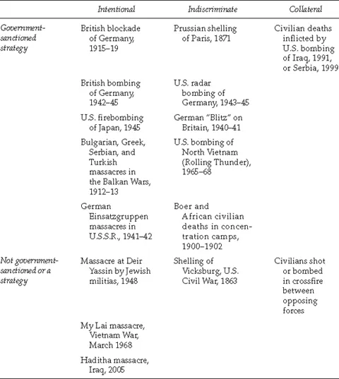 Contrast each of these strategies with the U.S. strategic bombing campaign during the 1991 Persian Gulf War. In that conflict, for example, F-117 aircraft bombed the Al-Firdos bunker in Baghdad, an installation that U.S. air planners believed was a command-and-control center. Unknown to these planners, however, the Iraqi regime was using Al-Firdos as a bomb shelter for civilian dependents of Iraqi officials. The air strike killed approximately two hundred to three hundred civilians. These deaths, although tragic, did not result from a government policy of targeting noncombatants. Nor did the casualties stem from a refusal to discriminate between soldiers and civilians, as the U.S. military did not even know there were noncombatants present at the target. Moreover, immediately after the Al-Firdos disaster, U.S. officials declared Baghdad off-limits to further air strikes, and few targets were struck in the Iraqi capital for the remainder of the war.14 Table 1.1 highlights the differences among these types of violence and provides examples of each.15