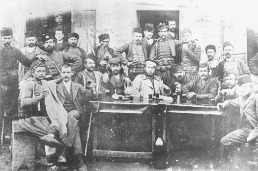 Bulgarian men at a traditional krĆchma in the Plovdiv region, date unknown. Courtesy of the Regional State Archive in Plovdiv.
