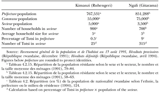 The most significant demographic difference between Kimanzi and Ngali is the relative and absolute number of Tutsi in each locale. As table 1.1 shows, the number of Tutsi in Kimanzi was extremely smallâaround twenty-five or so people according to the 1991 government census. This figure also matched residentsâ estimates. The small number of Tutsi in Kimanzi necessitated going beyond the immediate research site to talk with Tutsi survivors from neighboring secteurs in order to obtain a more detailed picture of what occurred in the area. Tutsi from neighboring secteurs were fair proxies for Tutsi from Kimanzi in terms of their experiences during the period of the civil war and genocide (1990â94), since most Tutsi fled in similar directions and at similar times. In Ngali, the number of Tutsi was much larger, but even here, I included three people who fled to Ngali from other secteurs. Having fled to Ngali, these people could also provide an important vantage point on how violence unfolded in Ngali and neighboring areas.