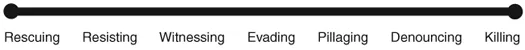 The research design drew its inspiration from Kristen Monroeâs (1991; 1996) work on altruism. To investigate altruistic behavior, Monroe constructed a continuum of rational behavior, anchored by self-interested actors at one end and selfless (altruistic) actors at the other. To study mass-level participation in violence, I constructed a spectrum of responses to genocide. At one end of the spectrum, I placed the least or anti-violent response, which I identified as ârescuing,â and at the other, the most violent, which I identified as âkilling.â In between those two poles I hypothesized a wide range of responses, including refusing to participate in the violence (resisting); witnessing without taking part in the violence (witnessing); avoiding participation in the violence (evading); turning people in to authorities (denouncing); and pillaging property (pillaging). I arrived at some of these categories prior to going to the field; others emerged during the course of the fieldwork, as I learned from peopleâs testimonies the kinds of actions people actually took during the genocide. What the spectrum provided was a way to think both deductively and inductively about the actions people took or could have taken during the genocide. Figure 1.4 shows the spectrum of responses to genocide that guided the research.