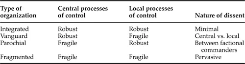 Insurgent groups have central processes of decision making and institution building and local processes of recruitment and tactical combat. Insurgent organizations differ in the strength of these control processes and the patterns of internal politics they create. Four types of insurgent groups can be identified according to how they combine central and local control: integrated, vanguard, parochial, and fragmented (table 1.1). Because groups can move between these organizational types over time, this typology is useful both for comparing groups with one another and for identifying changes within a group.