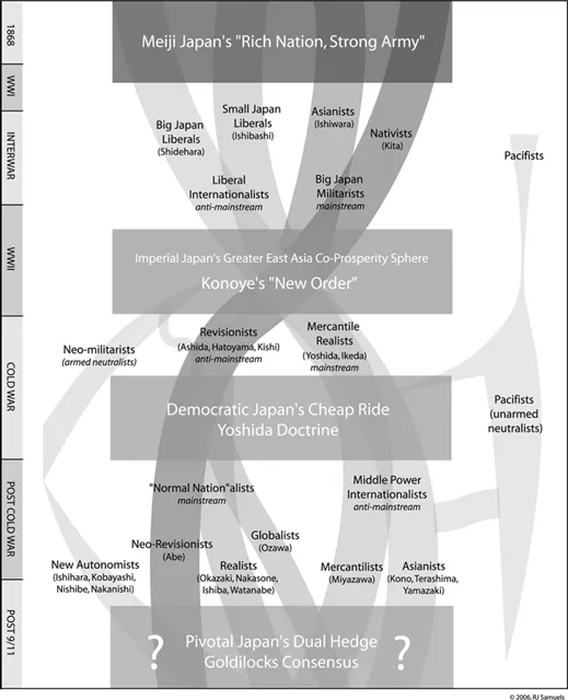 In this chapter I examine the ebb and flow of debates over Japanâs international posture and their importance for domestic politics. I demonstrate how international constraints and domestic politics have interacted repeatedlyâacross a range of domestic and world ordersâto filter and frame security policy choices. Alternating periods of dispute and consensus have engaged the entire national intellect, mobilizing at different times and in different measures liberals, nativists, Asianists, internationalists, militarists, nationalists, mercantilists, globalists, realists, and revisionists. These players have had shifting connections, many extending across the formation of the several new world orders to which Japan has had to adjust.1