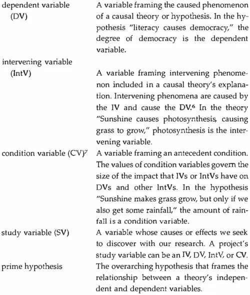 Theories are general statements that describe and explain the causes or effects of classes of phenomena. They are composed of causal laws or hypotheses, explanations, and antecedent conditions. Explanations are also composed of causal laws or hypotheses, which are in turn composed of dependent and independent variables. Fourteen definitions bear mention: