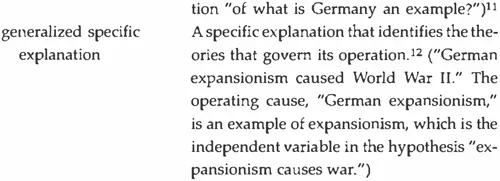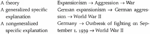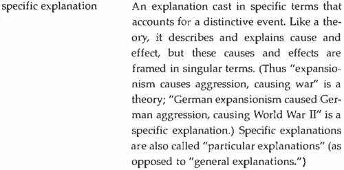 Explanations of specific events (particular wars, revolutions, election outcomes, economic depressions, and so on) use theories and are framed like theories. A good explanation tells us what specific causes produced a specific phenomenon and identifies the general phenomenon of which this specific cause is an example. Three concepts bear mention: