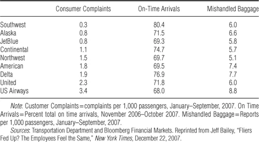 These views also overlook the considerable variation in strategies and practices in the U.S. airline industry. Hidden beneath the bleak results at the industry level are examples of individual airlines, both low-cost entrants and much older or so-called legacy airlines, that have pursued alternative employment practices and achieved more positive results for all of their stakeholdersâlow prices, high-quality service, profits, relatively good jobs, and less volatility. Two U.S. firms that will feature prominently in our analysis, Southwest Airlines and Continental Airlines, consistently are found in the upper half of the service-quality rankings reported in table 1.1 and have been listed among the 100 best places to work by Fortune magazine. The question then becomes whether and how these examples can be emulated to achieve a better balance among stakeholders and reduce volatility across the industry.