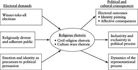 In this chapter, I elaborate a theoretic framework for how religious rhetoric intensifies the emotions and identities of the American public and what the consequences of these rhetorical choices are. Doing so requires knitting together several diverse strands of scholarship, encompassing research on religion, voting behavior, political communication, and social psychology. The basic argument, illustrated in figure 1.1, has several moving parts. The religious character of American politics is shaped by a confluence of three factors: the religious makeup of the U.S. electorate, the psychological basis of persuasion, and the political demands imposed by competitive winner-take-all elections. Religious rhetoric (particularly the civil religion genre) is uniquely adept at satisfying the demands imposed by each of the factors, enabling candidates to form deep connections with voters in competitive electoral environments. Moreover, when specific forms of religious rhetoric are strategically deployed by candidates, the consequences extend far beyond the realm of any single electoral contest. Precisely how candidates locate themselves at the intersection of these factors not only determines their electoral success but also has implications for defining the boundaries of the American political community and for shaping the dynamics of the representative process.