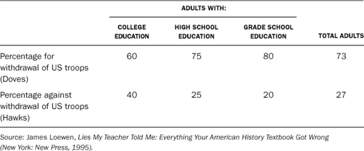 Loewen addresses the title question of this last chapter by choosing as emblematic a âVietnam exerciseâ he conducted with âmore than one thousand undergraduates and several hundred non-studentsâ over the course of a decade.2 In these experiments, he gave his class or audience a chart that showed the publicâs overall response to a Gallup poll question of January 1971: âA proposal has been made in Congress to require the US government to bring home all US troops before the end of this year. Would you like to have your congressman vote for or against this proposal?â After he had excluded the âI donât knows,â 73 percent of respondents answered âyesâ for withdrawal, whereas 27 percent answered âno.â Loewen left three columns of the chart preceding this overall breakdown blank, except for the headings of adults with âgrade-school education,â âhigh-school education,â and âcollege education.â He asked students to fill in how they imagined these opposing attitudes about the war broke down according to education, which, as discussion had made clear, could also be understood as a proxy for class. By a margin that approached 10 to 1, students consistently indicated that the college-educated adults would have been most critical of the war; the nonstudents agreed at the only slightly less-overwhelming margin of 9 to 1. A âtypical responseâ allocated the preponderance of withdrawal sentiment to the college-educated (90 to 10), close to average likeliness of calling for withdrawal (75 to 25) to the high schoolâeducated, and least likely to call for withdrawal to the grade school graduates (60 to 40). Students explained their interpretations in varied but related ways: the better-educated someone was, the more critical and liberal they were likely to be; working-class people in the United States had a self-interest in being pro-war because their jobs were more likely related to war-making (in factories or the military); and other responses indicating that the âarchetype of the blindly patriotic hardhatâ was alive and well. Antiwar sentiment, the great majority of these college students and nonstudents agreed, was the province of the privileged; the lower down that ladder you were, the more likely you were to have supported the Vietnam War.3