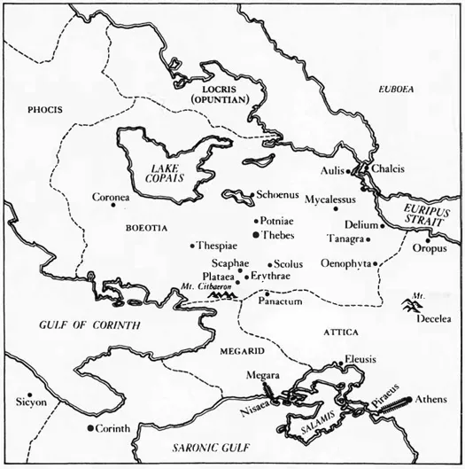 The Boeotians’ refusal to accept the peace is harder to explain. Thucydides’ narrative reveals that they refused to restore to the Athenians either the border fortress of Panactum, which they had seized in 422, or the Athenian prisoners taken in the Archidamian War. But these were not reasons for the Boeotian unwillingness to accept the peace, merely evidences of it. Though Thucydides explains the motives of the other recalcitrant allies of Sparta he does not do so for the Boeotians, so we can only speculate. The Boeotians, led by the Thebans, seem to have acted out of fear. Theban power, prestige, and ambition had grown greatly during the war. In 431, or soon thereafter, the citizens of Erythrae, Scaphae, Scolus, Aulis, Schoenus, Potniae, and many other small unwalled towns had migrated to Thebes and settled down, doubling the size of the city9 (see Map 2). In 427 the Spartans gained control of Plataea and turned it over to their Theban allies. Within a short time the Thebans destroyed the city and occupied its territory.10 Probably then, or soon after, the number of Thebes’ votes in the Boeotian federal council was increased from two to four; “two for their own city and two on behalf of Plataea, Scolus, Erythrae, Scaphae,” and a number of other small towns.11
