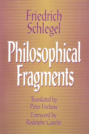 Yes, you can access Philosophical Fragments by Friedrich Schlegel, Peter Firchow in PDF and/or ePUB format, as well as other popular books in Philosophy & Philosophy History & Theory. We have over one million books available in our catalogue for you to explore.