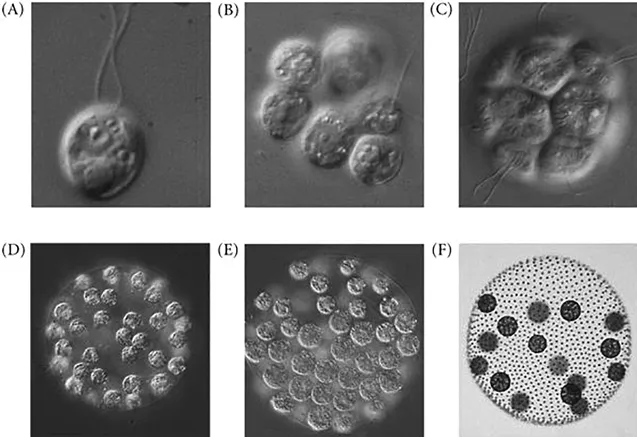 Figure 1.1. Algae of the family Volvoaceae, the genera of which are characterized by their number of cells, arrangement of cells, and differentiation of cells. The genus Gonium is characterized by four- to sixteen-cell aggregates, undifferentiated and arranged on a flat plane. (a) unicellular Chlamydomonas reinhardtii; (b) eight-celled Gonium pectorale, whose undifferentiated cells are arranged on a flat plane; (c) sixteen-celled Pandorina morum, whose undifferentiated cells are held together at the base and form a sphere; (d) thirty-two-celled Eudorina elegans, also undifferentiated and arranged as a sphere; (e) sixty-four-celled Pleodorina californica, whose cells are originally similar but differentiate and dedifferentiate over time as reproductive and nonreproductive types; (f) Volvox carteri, whose cells are fully differentiated early in development into reproductive and nonreproductive types. Courtesy of David Kirk.