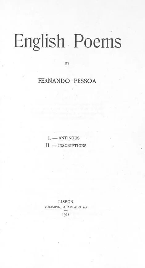 Pessoaâs most impressive literary response to the specific cultural, linguistic, and intellectual challenge brought forth by his assimilation of an imperial Englishness was embodied in the two collections of English poems he published in Lisbon in 1921, respectively titled English Poems IâII and English Poems III. The first volume contains Antinous, a long poem that was composed around 1915 and published as an independent volume in 1918, as well as a series of classically oriented epitaphs titled Inscriptions. In English Poems III, Pessoa published Epithalamium, an earlier long poem composed around 1913, eight years after his permanent return to Lisbon from South Africa in 1905. A prominent aspect of the publication of Pessoaâs two editions of his English Poems is perhaps that, except for Mensagem, his 1934 nationalistic collection of Portuguese poems, these three poems together with an English collection of Shakespearean sonnets, titled 35 Sonnets (1918), constitute the only poetry collections that Pessoa published during his lifetime under his own name.