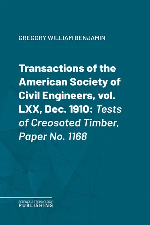 Transactions of the American Society of Civil Engineers, Vol. LXX, December 1910: Tests of Creosoted Timber, Paper No. 1168 is a comprehensive technical report that delves into the experimental analysis and performance evaluation of creosoted timber, a material widely used in civil engineering for its durability and resistance to decay. Authored by a committee of distinguished engineers and researchers, this volume presents the findings of a series of rigorous tests conducted to assess the structural integrity, longevity, and effectiveness of timber treated with creosote, a preservative commonly employed to extend the service life of wood used in construction, particularly for railroad ties, bridges, and other infrastructure exposed to harsh environmental conditions. The report meticulously documents the methodologies employed in the testing process, including the selection and preparation of timber specimens, the application of creosote treatment, and the various mechanical and physical tests performed to evaluate properties such as strength, elasticity, absorption, and resistance to biological degradation. Detailed tables, charts, and illustrations accompany the text, providing clear visual representations of the data collected and facilitating a deeper understanding of the results. In addition to presenting empirical data, the paper offers insightful discussions on the implications of the findings for the design, maintenance, and economic viability of timber structures. It addresses the comparative performance of different wood species, the influence of treatment methods, and the long-term benefits of creosoting in extending the functional lifespan of timber components. The authors also consider the practical challenges faced in the field, such as variability in timber quality and the environmental impact of preservative use. This volume serves as an invaluable resource for civil engineers, architects, researchers, and students interested in the science of wood preservation and the advancement of construction materials technology. It reflects the early 20th-century commitment to scientific inquiry and innovation within the engineering profession, offering both historical context and enduring insights relevant to modern infrastructure development.