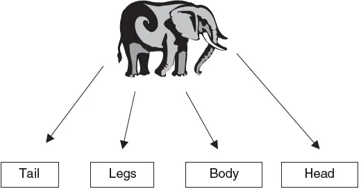 A frequently used analogy is the old question: āHow do you eat an elephant?ā The answer, of course, is: āOne bite at a time.ā So the first step in preparing an outline is to start defining and categorizing the ābites.ā The bites are important because that is where the useful work is accomplished. For a project, brainstorming can help define the ābitesā or activities from the bottom up or a process of ādecompositionā can be used starting from the top, and subdividing the project (or the entire elephant) into major sections and working down as shown in Figure 1-1. In either approach, the objective is to develop a structure of the work that needs to be done for the project.