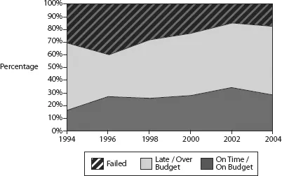 The data on project success rates are alarming. According to the Standish Groupās CHAOS Report, based on biennial surveys of software project outcomes, about 75 percent of all software projects are delivered late or fail. The data also show that since 2002, the rate of successful project completion has dropped significantly.1