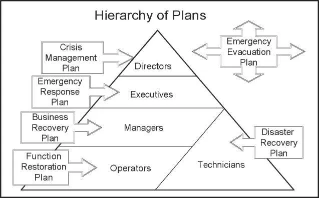 In most organizations there are five key classes of personnel, each with particular levels of interest and types of concerns. Earlier in this chapter, Figure 1-3 showed the relationship between plan types and areas of responsibility. Many of these interests and concerns will be shared with others, but in practice the actions and responsibilities of individuals will reflect their position within the hierarchy. Almost separate to the main thrust of the business operation is the general concern for the health and safety of everyone in times of danger. This is usually the concern of the security people who watch over and protect the others without being integrated into the core business functions. Indeed, the very nature of their job precludes them from developing close links or relationships with any particular area or group. They have to retain a degree of independence.