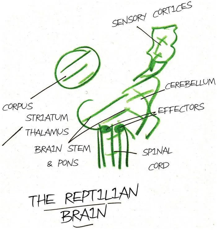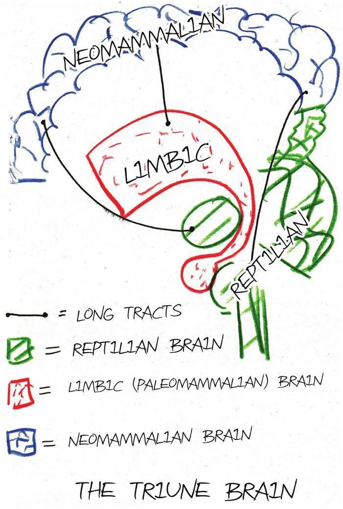 Nature is of course interested in change and growth (by and large). So after another really, really long time the wet sponge gradually grew a nervous system (you have to have a nervous system if you are going to do any of the most basic functions - such as moving, eating, having babies, etc.). That nervous system (through a process of incredibly complex evolution) ended up as the deepest and most primitive part of your brain, the soâcalled reptilian brain (the green bit in Figure 1). This was the first step towards evolving what P. D. MacLean1 has called the triune brain, the ultimate expression of which is seen in you.