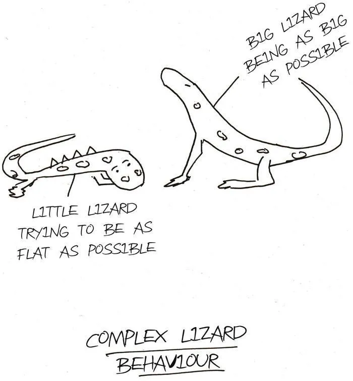 Outside these essential but ultimately basic functions the reptilian brainâs ability to perform more complex tasks is extremely limited. In fact it is estimated that in its most highly evolved state (and the well reported example of this highly evolved state is the Mexican green lizard) this brain is capable of 27 different behaviours. These behaviours (whilst they might tax the brain of my uncle Thomas at three in the morning after a good Friday night feed of drink) are not complex and involve things like moving from the heat to the shade, from the shade to the heat, and finding water. The most complex behaviours that reptiles get up to are to do with active and passive stances (Figure 4)3. These are slightly more complex and involve a small lizard crouching down submissively when confronted by a large lizard, and the larger lizard standing up aggressively. This stops the larger lizard from attacking the smaller lizard and therefore wins as a topânotch survival behaviour. In human behaviour the very same thing still goes on - after all in every corridor of power exactly the same survival behaviours can be witnessed!
