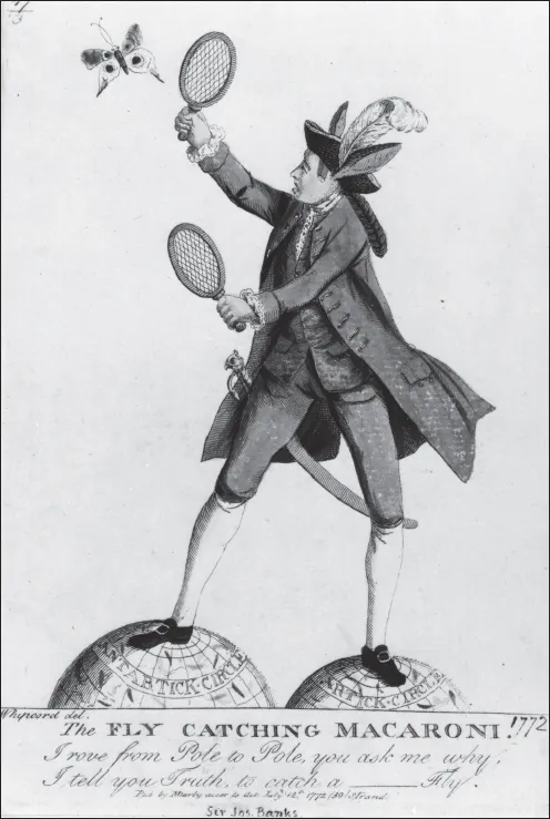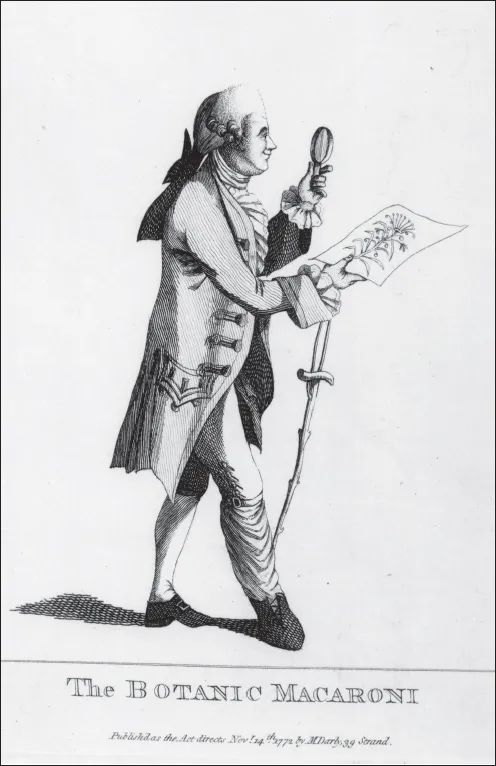 Banks became known as the ‘Botanic Macaroni’ (Figure 1). The term ‘Macaroni’ was originally coined to denigrate the aristocratic youths who had acquired continental manners during their Grand Tour to Italy, but it became a more general term of abuse for deriding foppish young gentlemen who adopted ridiculous extremes of stylish clothing. The label was laden with sexual contempt. A Macaroni, sneered one journal, is ‘neither male nor female, [but] a thing of the neuter gender … It talks without meaning, it smiles without pleasantry, it eats without appetite, it rides without exercise, it wenches without passion.’4 Just as plants were grouped into families, and people into tribes, so too the caricaturists identified different types of Macaroni, classifying them by the streets they paraded in, or the occupations they devised to fritter away their time.